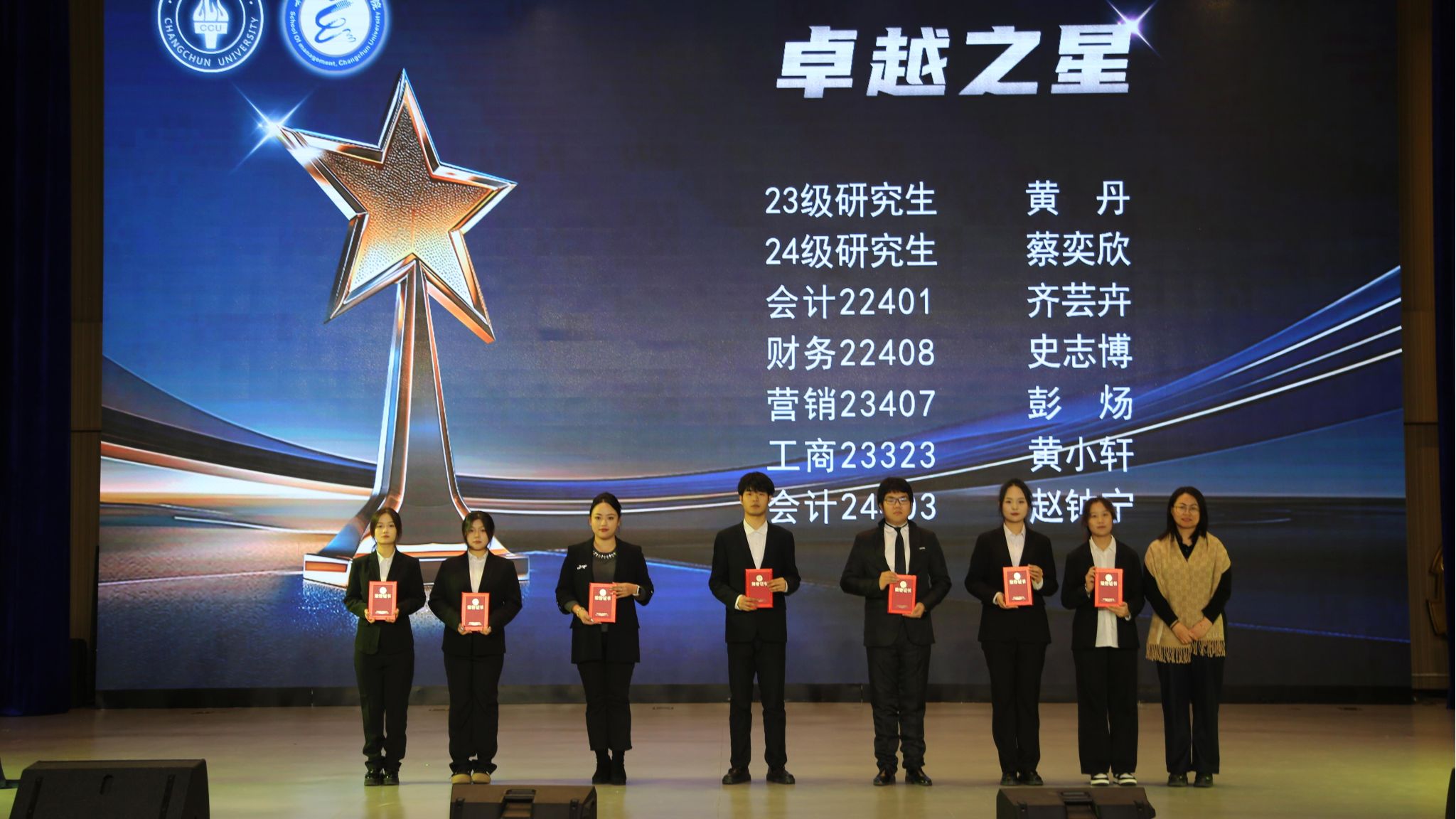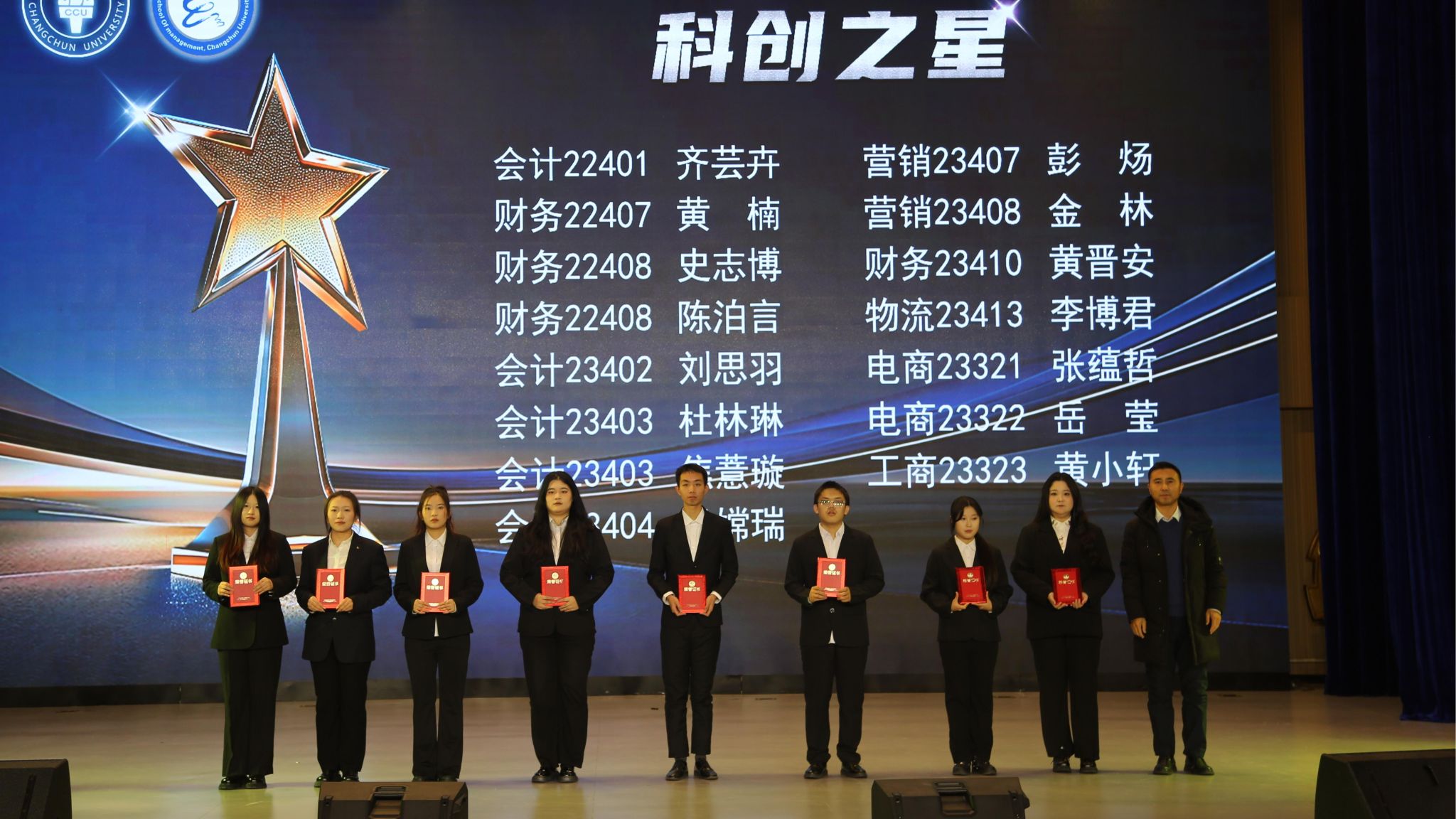 学院高度重视学生学科竞赛和创新实践能力的培养,持续打造高水平学科竞赛体系。学院举办多项校级赛事,其中包括:长春大学第十三届“新道杯”沙盘模拟经营大赛、第七届“科云杯”大学生财会职业能力大赛、长春大学“中联杯”大学生智能估值大赛等10余项比赛,覆盖全校研究生与本专科各年级学生,营造了浓厚的“以赛促学、以赛促创”氛围。结合各类竞赛积分,学院设立“科创之星”、“卓越之星”等六个奖项,与会嘉宾分别为获奖学生代表颁发荣誉证书。