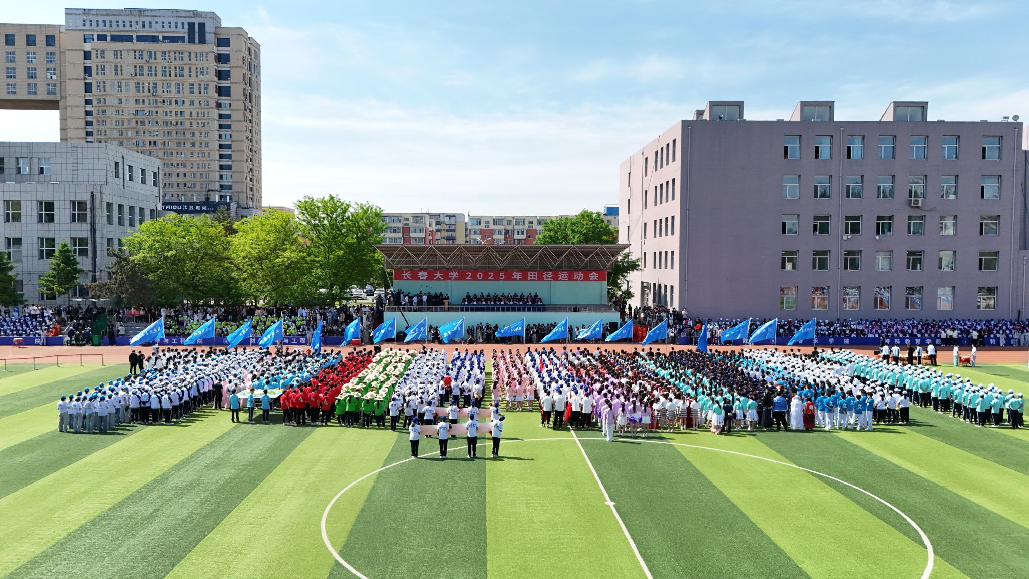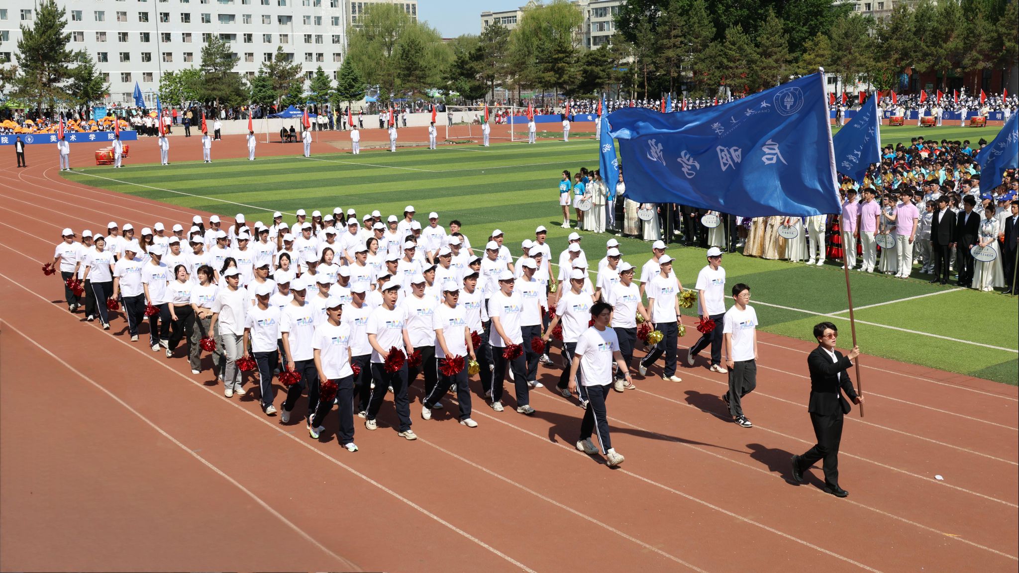 在激昂的旋律中,国旗护卫队、红旗队、花束队,以及来自全校18个学院的检阅方阵依次入场。他们昂首阔步,目光如炬,走过主席台,各具特色的展演,尽显长大人积极向上的精神风貌。